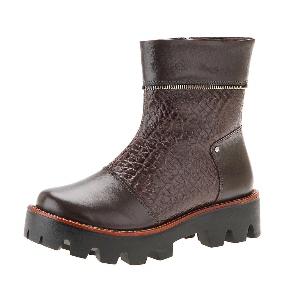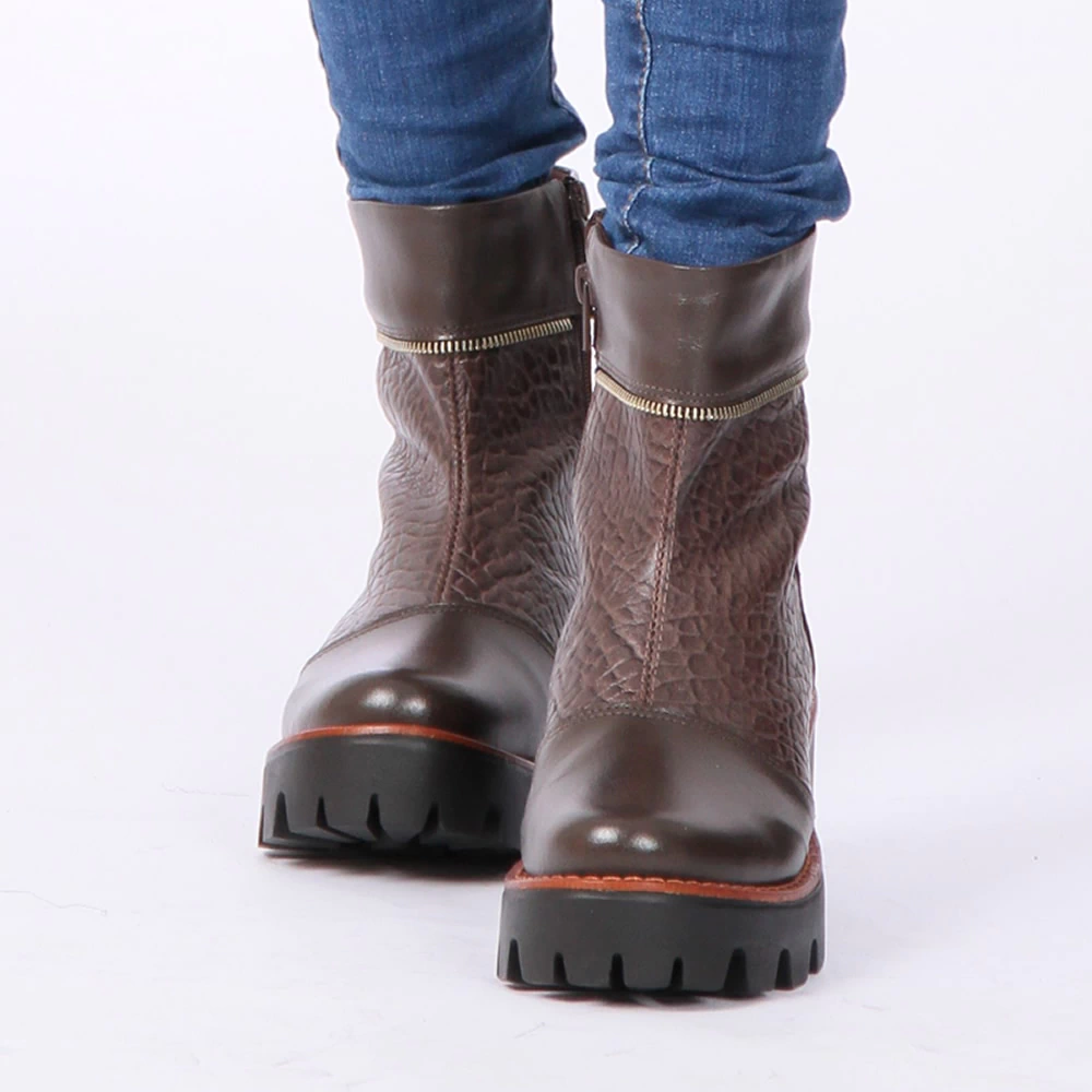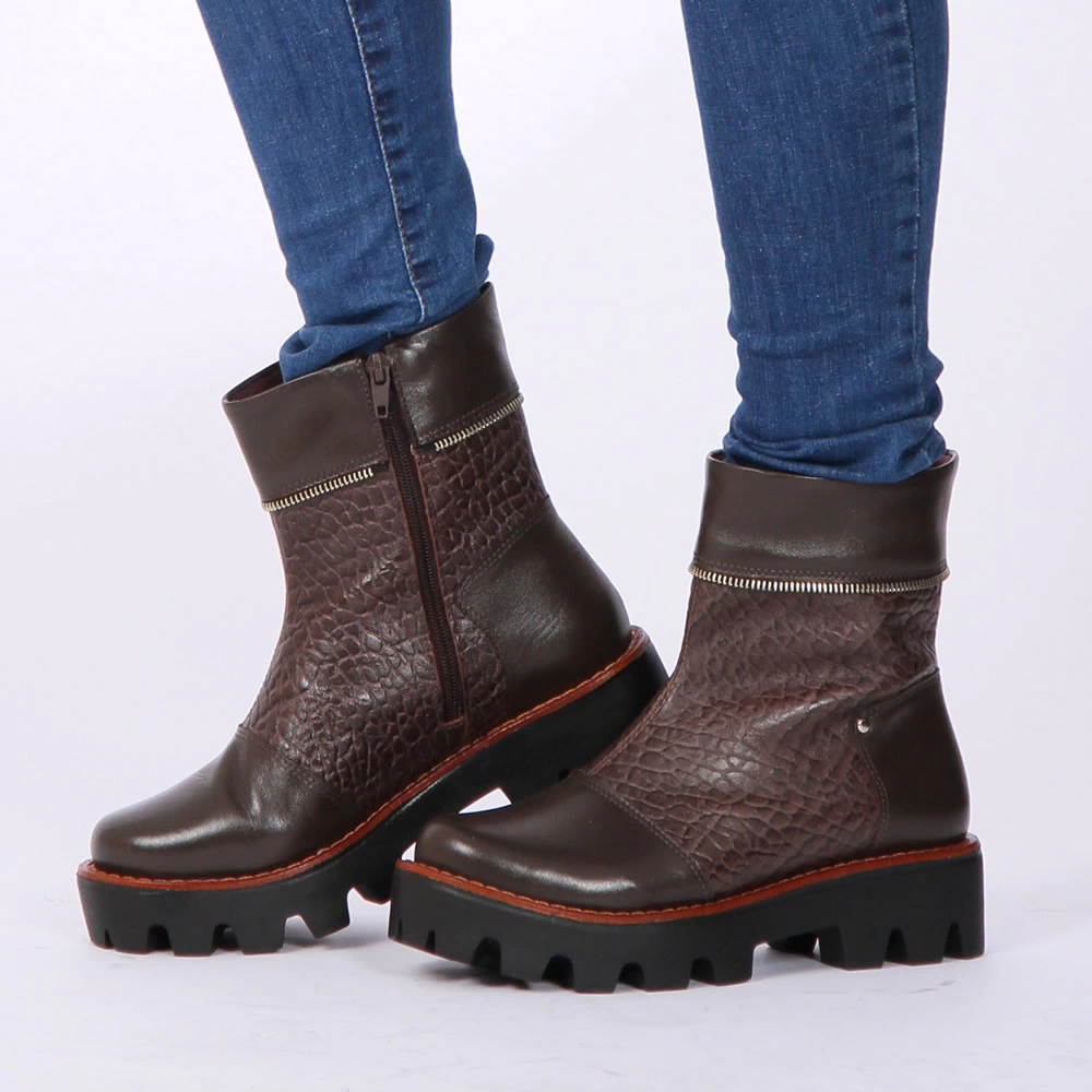 Uma Bota Coturno Feminina produzida toda em Couro Natural na cor Café, e com uma textura croco, que imita a pele de um crododilo.