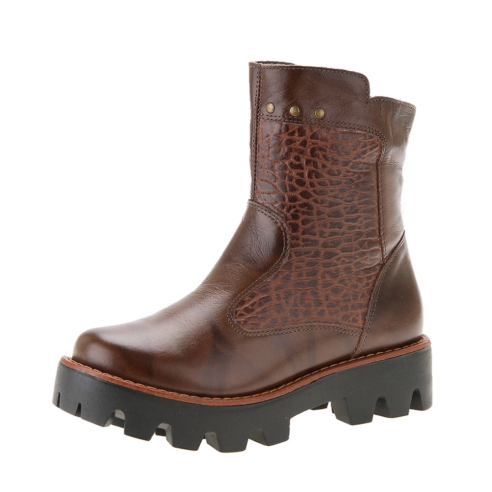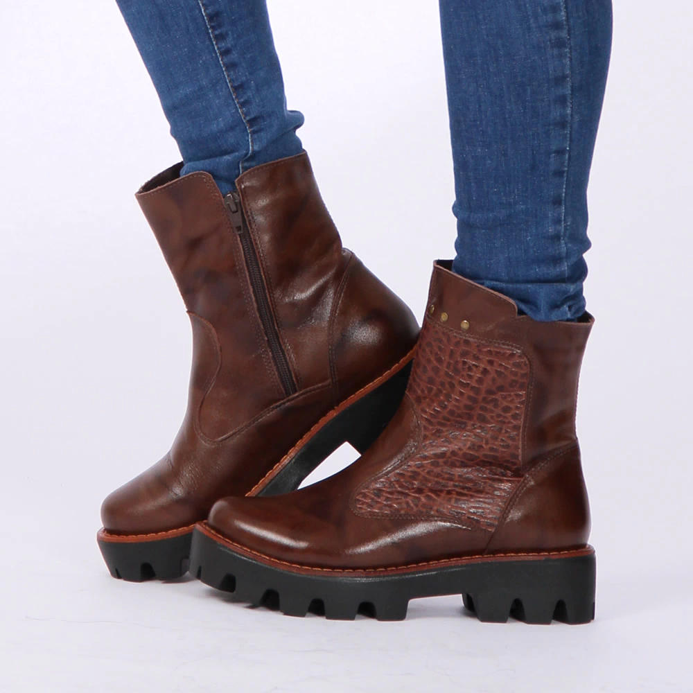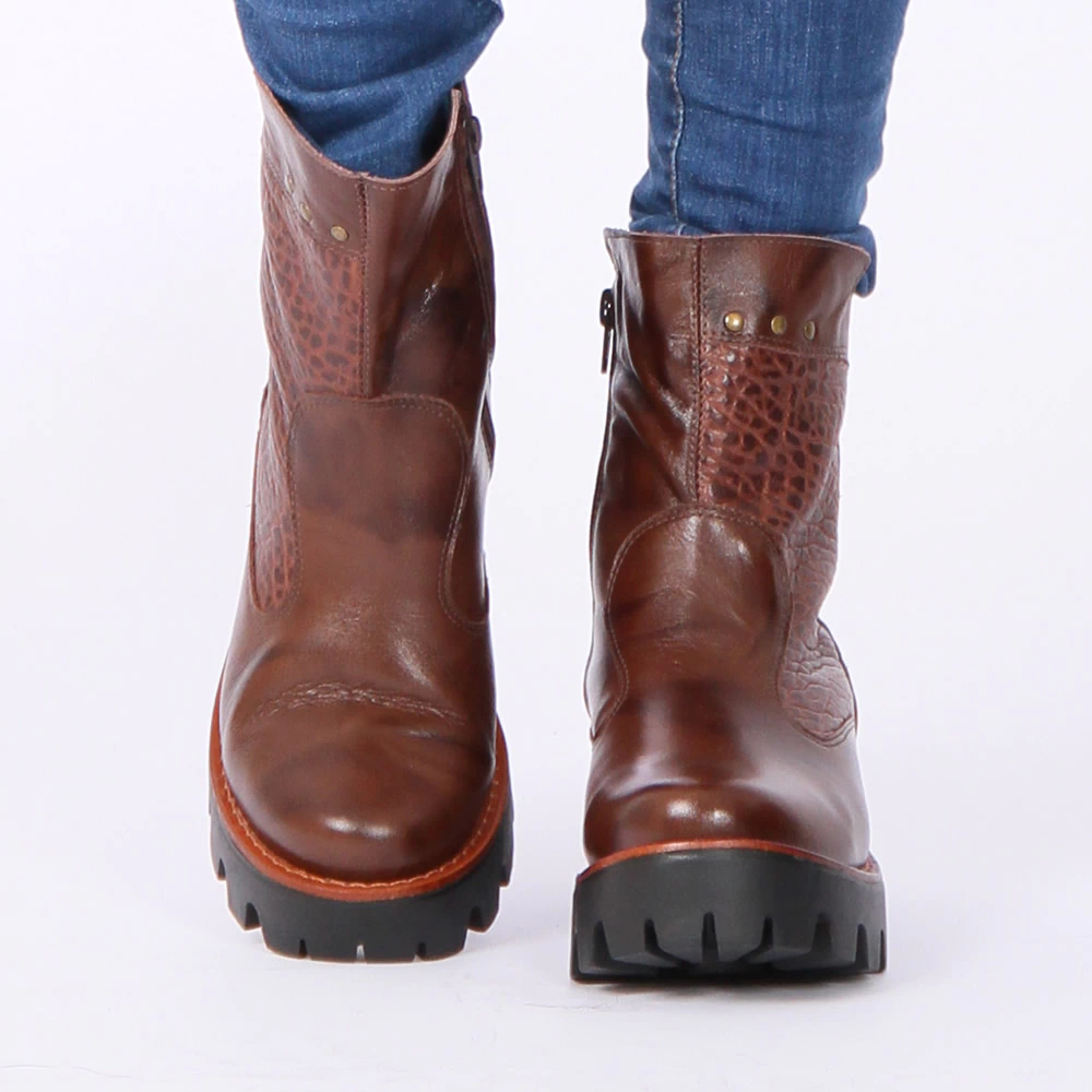 Seu fechamento é com zíper, seu cano chega à 15cm de altura e possui detalhes em couro croco que dá todo um estilo ainda mais aventureiro para essa bota.
