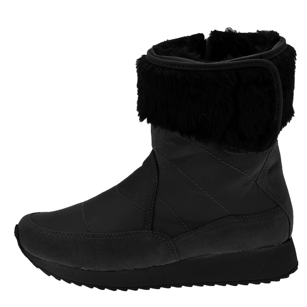 Bota para inverno produzida em camurça e nylon na cor preta, com forro em lã sintética preta, e com uma charmosa faixa de pelinhos, estilo polaina, para dar aquele acabamento lindo no seu tornozelo.