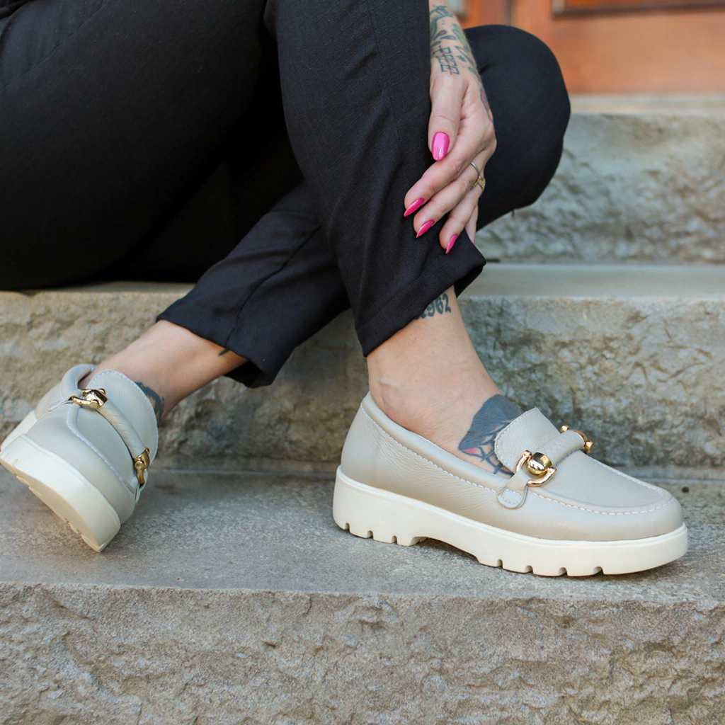 Este sapato em couro é uma peça de destaque para quem aprecia elegância e estilo. O detalhe de travessa no peito do pé, com um toque especial em cor dourado, adiciona um elemento de sofisticação e glamour ao sapato. Feito com couro de alta qualidade, este calçado oferece durabilidade e resistência, garantindo que você possa aproveitar seu estilo por muito tempo. Além disso, o couro confere um aspecto luxuoso e refinado, perfeito para e eventos formais. A palmilha em espuma proporciona um conforto excepcional ao caminhar. Ela é macia e possui propriedades de amortecimento, cuidando do seu conforto durante todo o dia. Você sentirá seus pés acolhidos e protegidos em cada passo. O solado em Eva com 3,5 cm de altura oferece estabilidade e absorção de impacto. A altura do solado proporciona uma postura confortável e confiante ao caminhar. Além disso, o solado em Eva é conhecido pela sua leveza e flexibilidade, permitindo que você se mova com facilidade. O detalhe dourado na travessa eleva ainda mais o charme deste sapato.