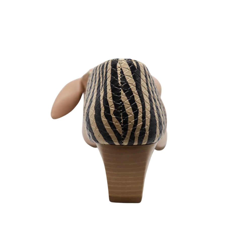 No calcanhar há uma estampa em animal print estilo zebra em amendoa e rosado, o que dá um toque de colorido e diferenciação nesse calçado.
